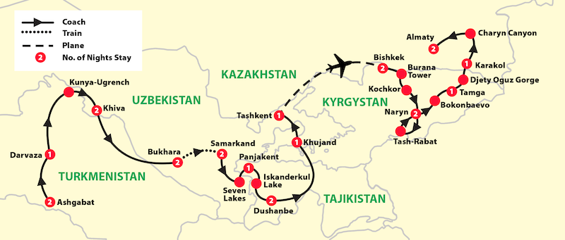 - Journey through Turkmenistan, Uzbekistan, Tajikistan, Kyrgyzstan and Kazakhstan on one epic 23-day adventure